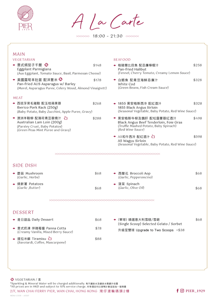 A La Carte – Featuring a tantalizing range of options from fresh seafood to meats to delectable pasta dishes.– Serving from MON to SUN 18:00 – 21:30.– All prices are in HKD, and subject to 10% service charge. Menu Details: Reserve