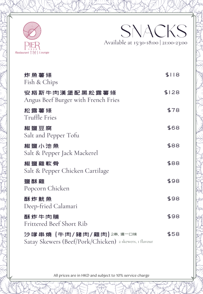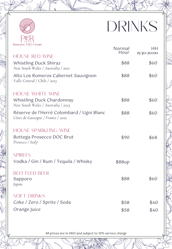 happy hour – Enjoy the dirnks and snacks.– Available at 16:30 – 20:00.– All prices are in HKD, and subject to 10% service charge.Menu Details: Reserve